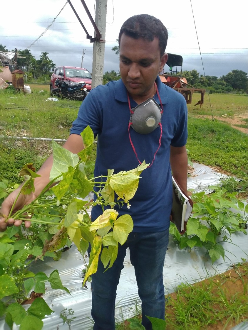 KVK Subject Matter Specialist visited to Problematic field of French Beans Arka Arjun which belongs to farmer Mr. Pavan Hebbur, Tumakuru Taluk on 07.07.2020. The French Beans plot infected with rust and yellow mosaic virus. Bean rust is a fungal disease affecting leaves, pods and stems. We suggested spraying fungicides,vegetable special at suitable intervals and drenching with Arka Microbial Consortium.