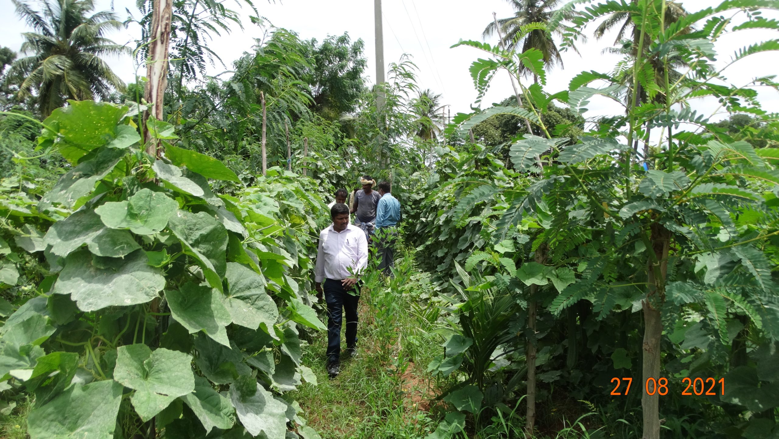 A field day Programme was arranged to demonstrate the new variety of Ridge gourd “Arka Prasan” released by IIHR, Bengaluru at Rangasamudra village in Madhugiri Taluk of Tumakuru District. This programme was arranged in Mr.Manjunath Reddy Farm. In this programme more than 40 farmers of surrounding villages of Rangasamudra Participated and gained information about this new variety of Ridge gourd. The Farmer has taken up this crop in an area of one acre land and the prominent technology he used are the new Ridge gourd variety- Arka Prasan, Use of Vegetable special, Use of Fruit fly traps and farmer informed the gathering that he may be able to harvest around 15 tons of yield and expecting to get the net income of Rs.1 lakh. On this occasion Dr.Somashekhar, SMS(Plant Breeding) had spoken and informed the gathering about the Potential of this Variety and the role of seed treatment on control of various diseases and pests, later discussed various improved technologies to be followed to get the maximum yield in this crop. Mr.Shasidhar K N, Technical Officer of KVK, Hirehalli also participated and coordinated in the programme. Totally 40 participants were present during the programme, later field visits were also arranged to know live demo of the crop. In this programme, Mr.Suresh N , Member of Gram panchayath also participated and appreciated the effort of Mr.Manjunath reddy to take up this new variety and suggested all the farmers to take up this new variety in their farm to get the higher returns.