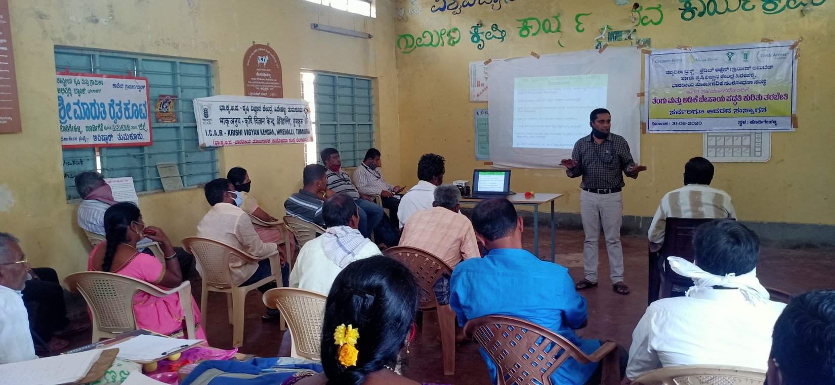 KVK(ICAR-IIHR), Hirehalli Tumakuru organized a ICM in Coconutoff campus training programme on 31st August 2020. Sri Ramesh and Sri PrasanthJM, are the experts during the programme. The program was participated by 29 farmers from neighbouring villages of Kodigehalli,Tumakuru and staff of Navayadisha. The programme coordinated by K.N.Jagadish KVK, Hirehalli Tumakuru.