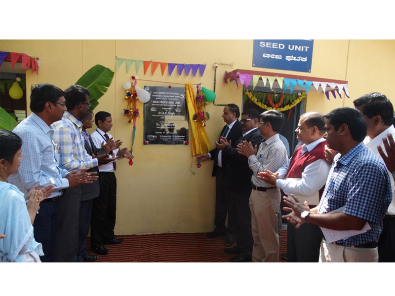 On 7th Jan 2017, Dr.A.K.Singh, Honourable Deputy Director General (Agricultural Extension &Additional Incharge Horticultural Sciences), ICAR, inaugurated a Seed Processing Unit at KVK, Hirehalli, Tumakuru, Karnataka. The unit was constructed under the support of RKVY, Govt. of India. The other guests presented were Dr.T.Janakiram, Honourable ADG (Horti.Science), Dr.M.R.Dinesh, Director, ICAR-IIHR, Dr.Sreenath Dixit, Director, ATARI, Bengaluru, Dr.C.K.Narayayana, Chairman, PME Cell (IIHR), Dr.G.Karunakaran, Head-in-charge, CHES, Hirehalli. The programme started with an interaction meeting of respected DDG and ADG with farmers and scientists of KVK. Dr.Janakiram stressed upon the new varieties introduced by ICAR-IIHR to be used among the farming community. Respected DDG, in his speech, mentioned about various schemes initiated by ICAR for the welfare of farmers. During the day Soil Health Cards were distributed to farmers of Tumakuru. Later he inaugurated the seed processing unit.