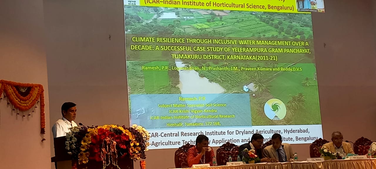 KVK, Scientist participated in the International Conference on “Reimagining Rainfed Agro-ecosystems- Challenges & Opportunities (ICRA-2022)” at CRIDA, Hyderabad from 22-24th December 2022 and exhibited NICRA KVK activities, products. Mr. P.R.Ramesh, SMS,Soil Science, KVK,Hirehalli presented the research paper on “Climate resilience through inclusive water management over a decade; a successful case study of Yeleramapur Gramapanchyat, Tumakuru district.”