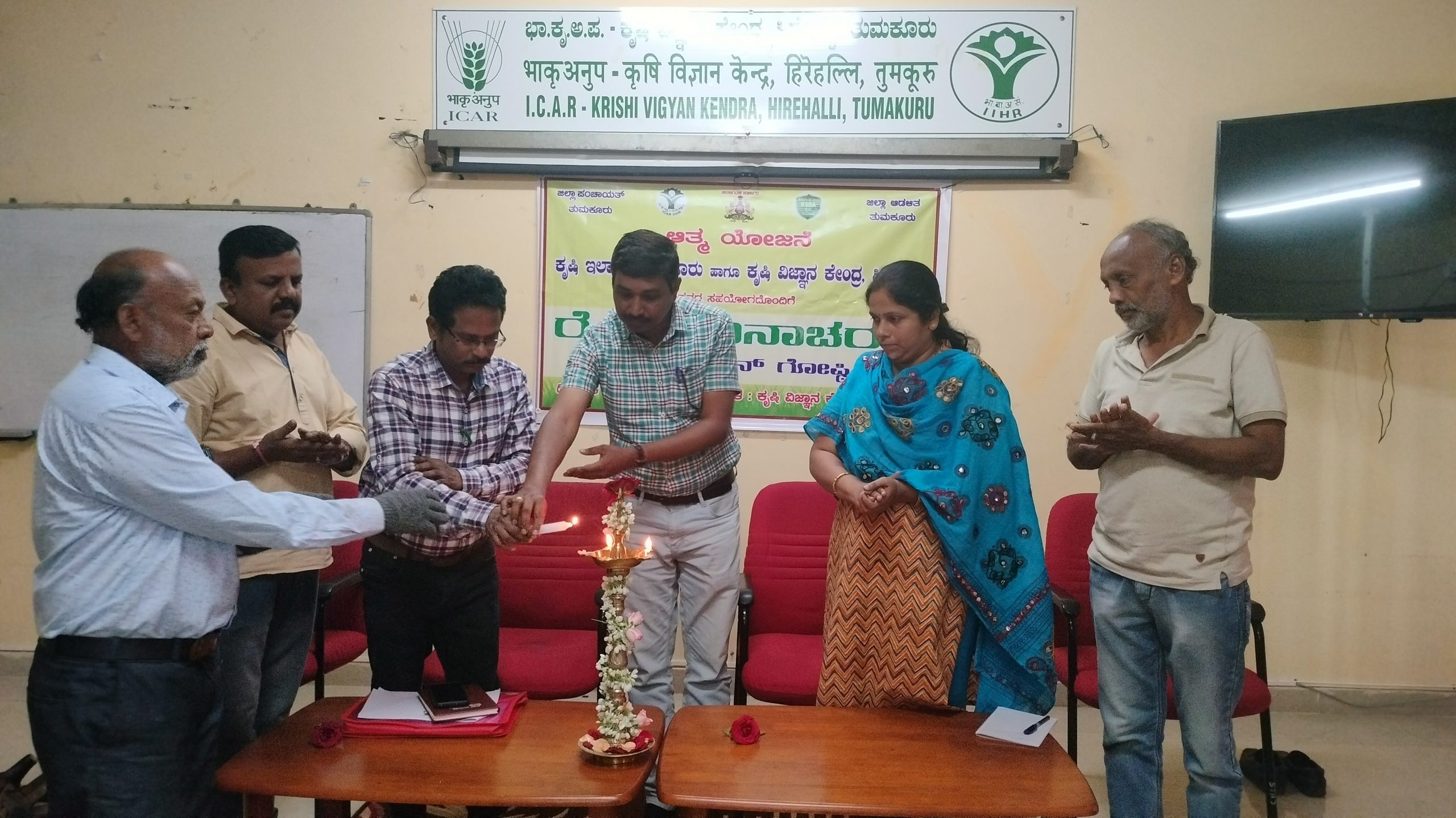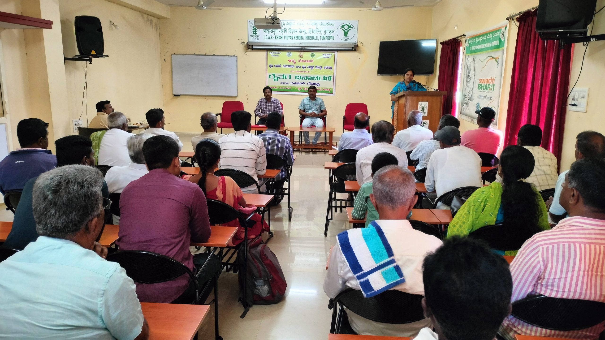 In collaboration with Department of Agriculture “ Kisan Diwas-2022″ was organized at ICAR- KVK, Hirehalli on 23rd December 2022.During the occasion five innovative farmers were felicitated. Mr. Aswath, Assistant Director of Agriculture, Tumakuru highlighted the importance of Kisan Diwas and details about the various schemes for the farming community. Dr. Somasekhar, SMS-Plant breeding, KVK, Hirehalli highlighted the importance of sustainable agriculture. He also gave the information on the various activities being conducted at KVK, Hirehalli. The programme concluded with vote of thanks by Mr. Sridhar of ATMA Scheme. The programme was coordinated by Mrs. Radha R Banakar, SMS Home Science, KVK, Hirehalli, About 50 farmers, ATMA scheme staff and other KVK staff were participated.