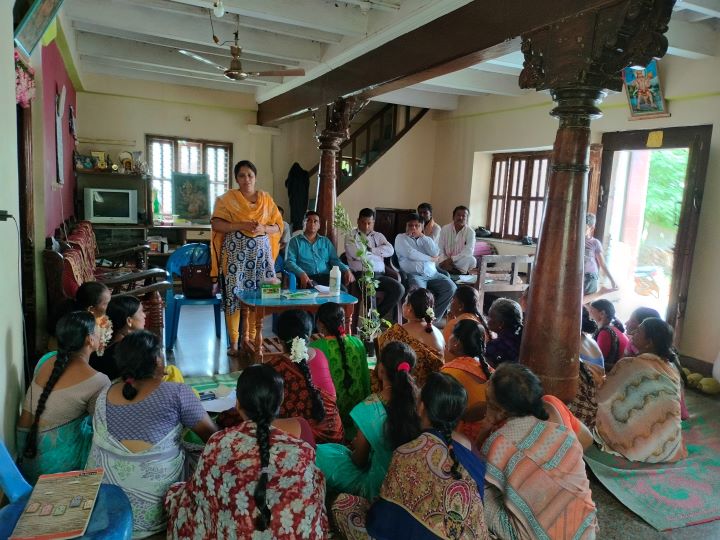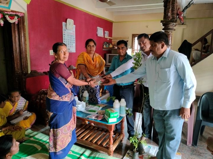 Off-campus training cum demonstration on Nutri-Garden was conducted on 22nd June 2022 at Hosapalya village of Sira Taluk. Mrs Radha R.Banakar, SMS-Home Science, KVK, Hrehalli explained the role of fruits and vegetables in daily diet to achieve nutrition security among farm family members. Mr Prashanth J.M, SMS-Horticulture, KVK, Hirehalli explained about the layout and uses of some medicinal plants and Mr Ramesh P.R SMS-Soil Science briefed about the use of organic micronutrients and foliar application in nutri gardens. This training programme was attended by 25 farmers and farm women from Hosapalye village. Later basic data of selected farm families was collected and critical inputs (seed kit, some fruits and medicinal plants seedlings, micro nutrients, AMC..etc) were distributed to the selected farm women. This programme was co-ordinated by Mr.Tipperudrayya, Swavalambi FPO, Bukkapattana, Sira Taluk.