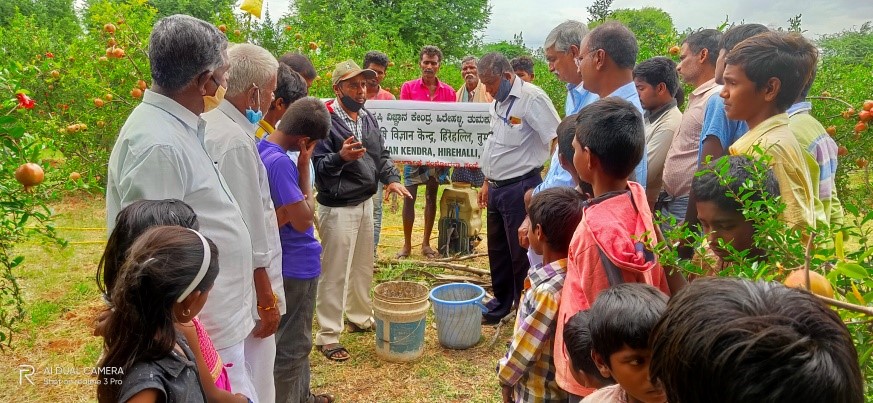 Need based training programme on improved production practices in Pomegranate was organised at Venkatapura village of Pavagada taluk by ICAR-KVK Hirehalli in collaboration with Department of Horticulture, Pavagada. About 22 farmers were participated in the training. Dr. N. Loganandhan, Head, KVK, Hirehalli Tumakuru highlighted the significance of organic products produced by the KVK and its role in Pomegranate production. Mr. Prasanth JM SMS, Horticulture explained in detail pomegranate production practices, Use of Arka Microbial Consortium and Pest and Disease management. Mr. Ramesh PR SMS, Soil Science explained the importance of Soil testing, Micronutrient application in Pomegranate and method demonstrated the application of AMC in Pomegranate field.