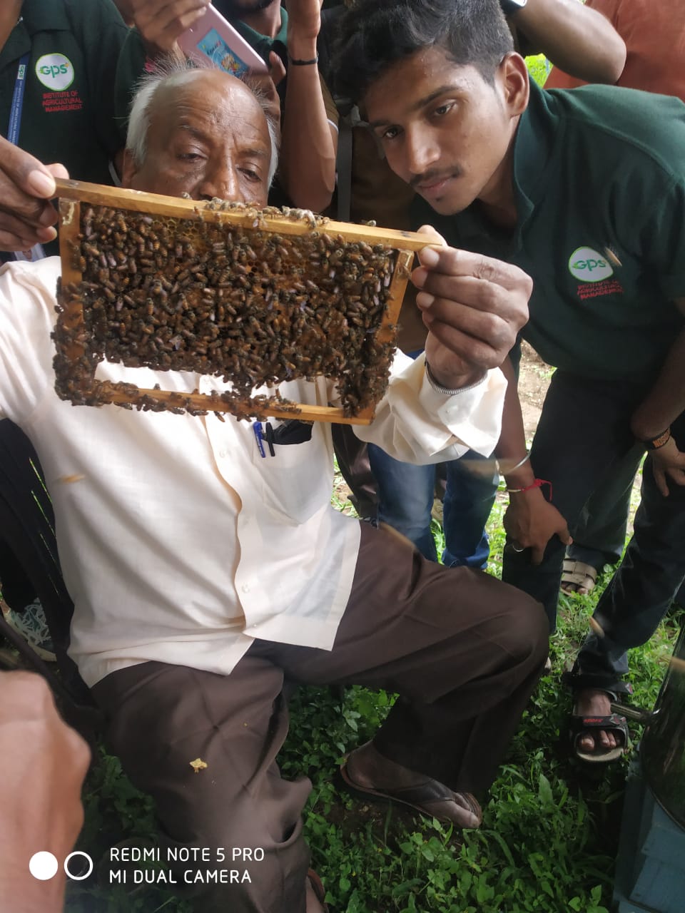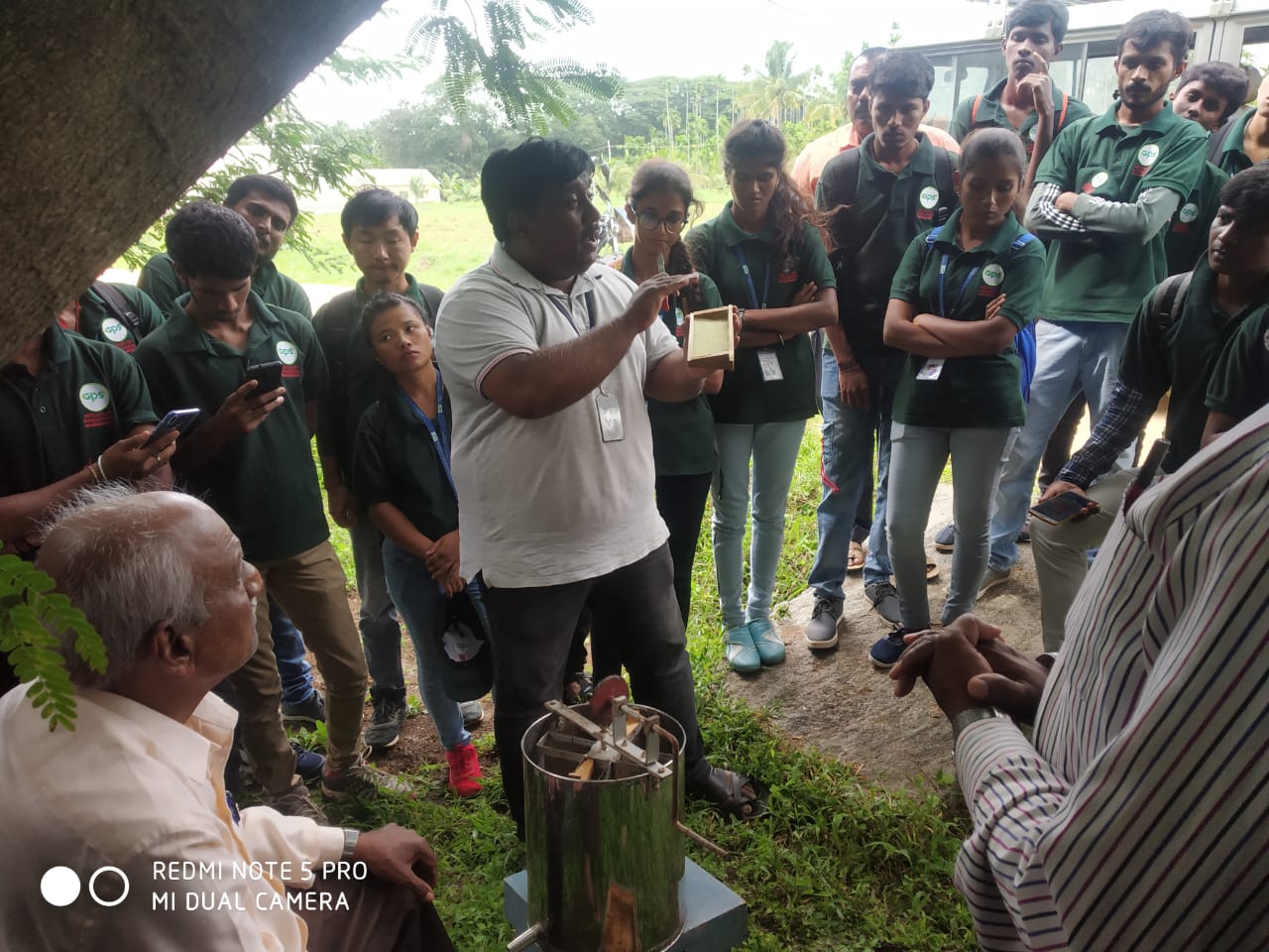 Paid training programme on beekeeping was organized on Aug 31, 2019 at ICAR- Krishi Vigyan Kendra (IIHR), Tumakuru. Beekeeping Expert Sri Shanthaveeraiah was invited speaker for training programme. Participants are Farmers of ICAR-KVK adopted village of Tumakuru and Students of GPS institute. This training aimed at enhancing the awareness among farmers about beekeeping and the pollination services offered by honeybees. During the day, students and farmers trained in maintenance of the beehives, beekeeping accessories and live bee colonies. Preliminary information on how to start beekeeping, management of beehives during dearth periods, the economics of beekeeping, bee products and role of bees in crop pollination was explained to the farmers.