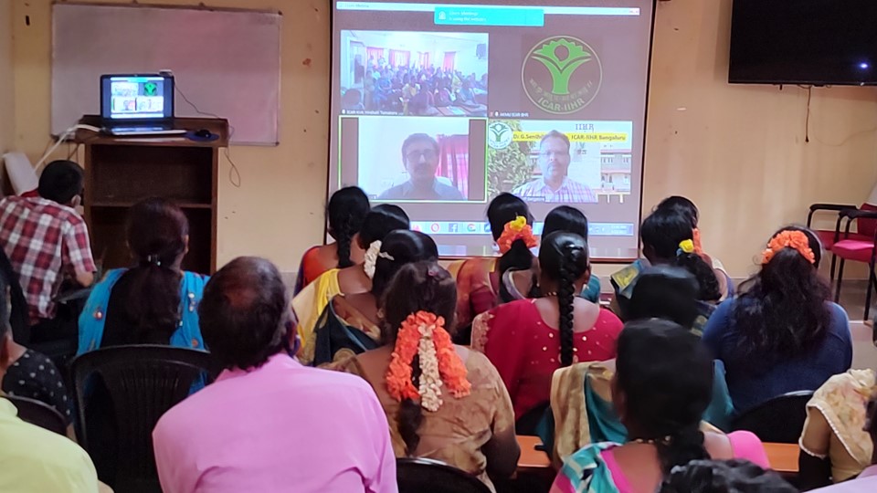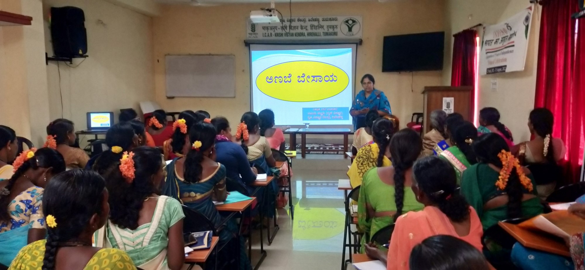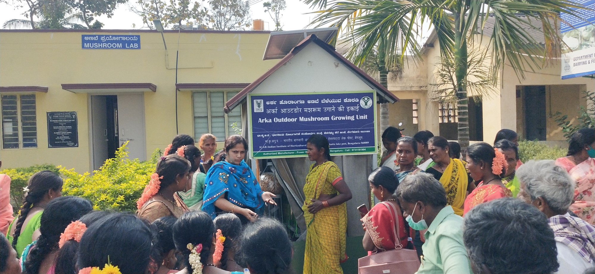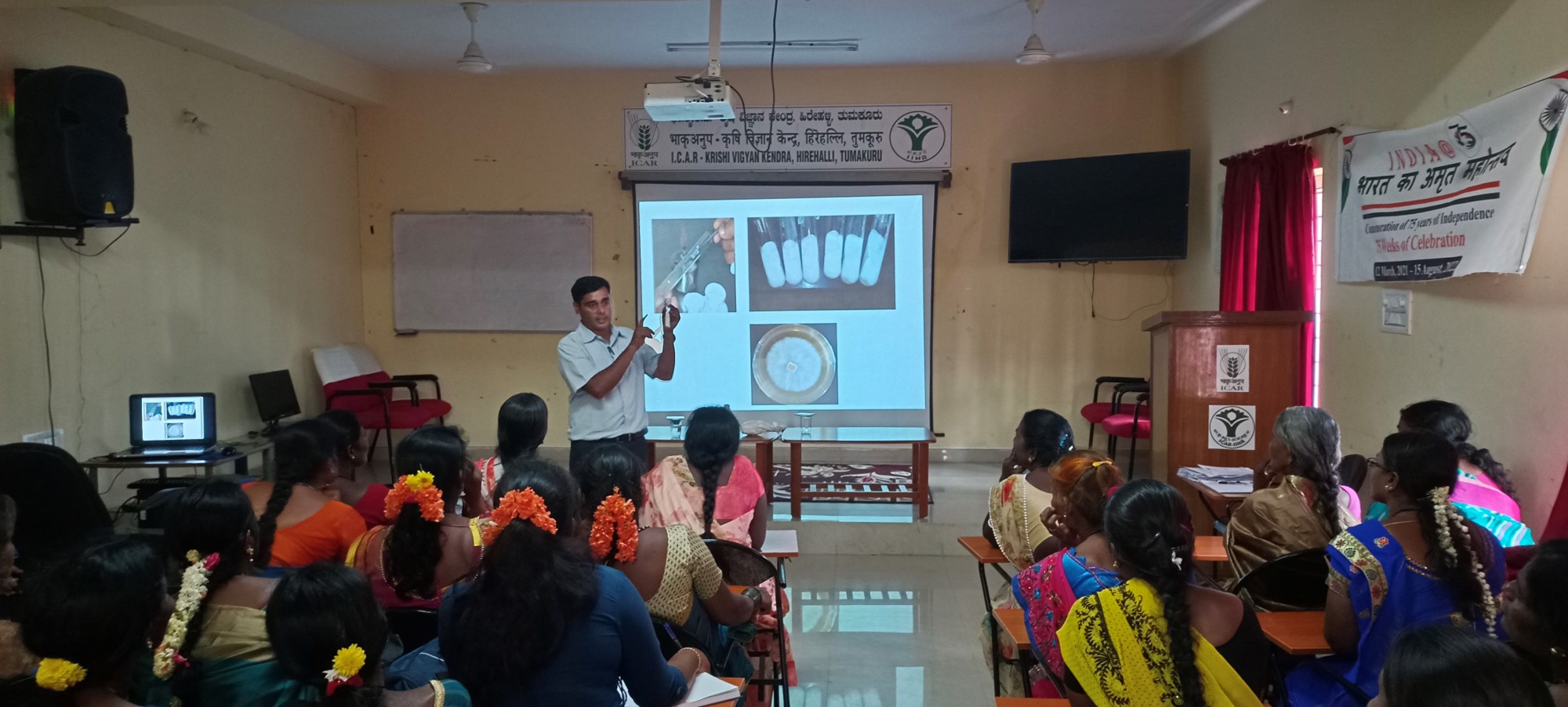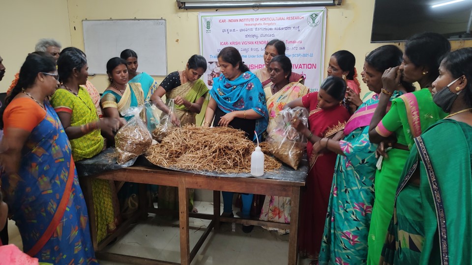 Training programme on Mushroom Cultivation was conducted on 22nd March 2022 at Krishi Vigyan Kendra,Hirehalli, Tumakuru. This training programme was organized in collaboration with BESST-HORT, ICAR-Indian Institute of Horticultural Research, Bengaluru under Scheduled Caste Sub Plan-2021-22. In the inaugural session, Dr, Loganadhan .N, Principal Scientist and Head, ICAR-KVK, welcomed the guests and participants. Dr G.Sentilkumaran, Principal Scientist, Department of Post Harvest Technology and Agricultural Engineering, ICAR-IIHR, Bengaluru explained about the SCSP programme. Later Mr Ramesh P.R, SMS-Soil Science delivered lecture on spawn production techniques. Mrs.Radha R.Banakar SMS- Home Science gave a lecture on nutritional importance of different kinds of mushrooms along with mushroom cultivation techniques. Later Trainees were demonstrated mushroom bag filling and bag incubation methods for preparation of Oyser mushroom RTF bag preparation. At the end, training manuals were distributed to all the participants. This training programme was attended by 50 SC farmers and farm women from Pavagada, Madugiri and Koratagere taluks of Tumakuru district.