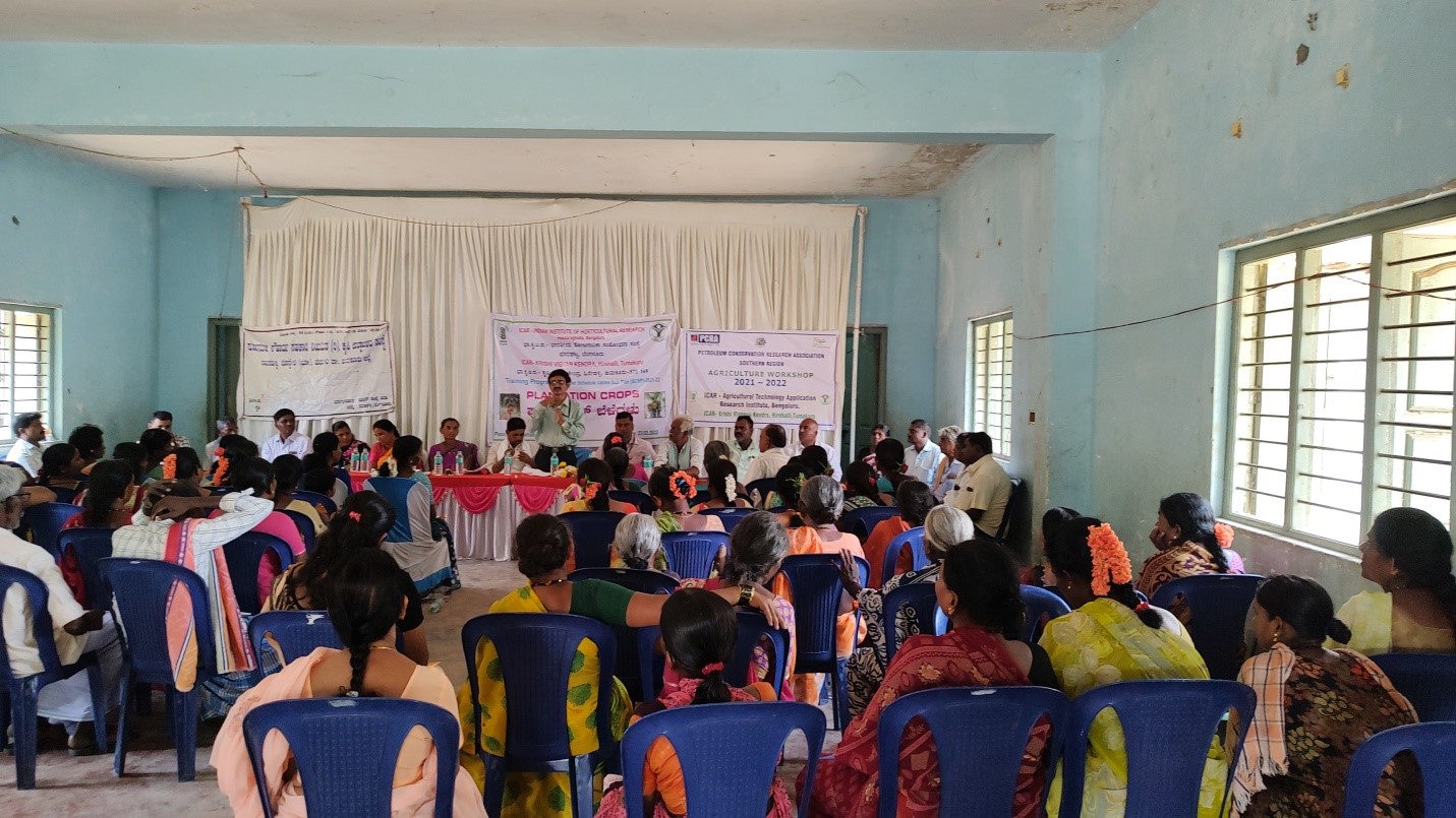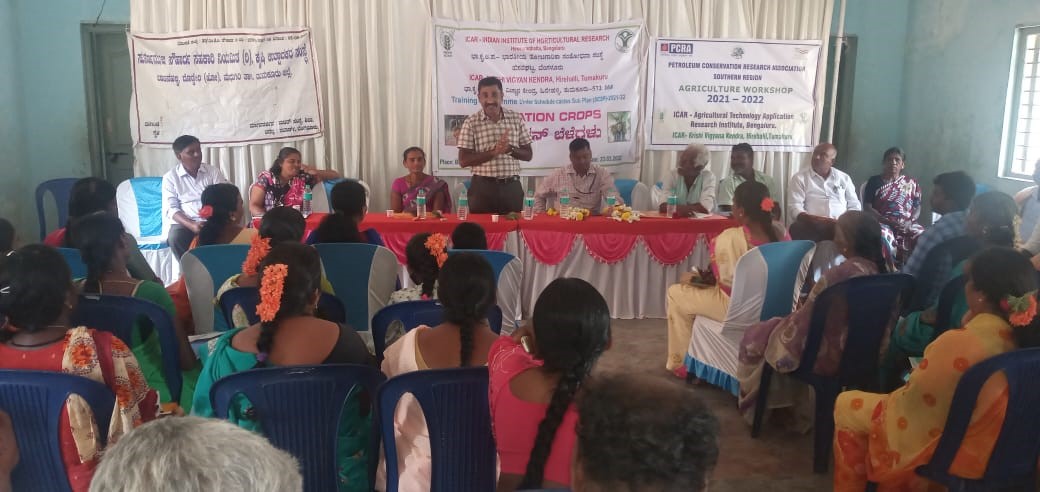 Training programme on Plantation Crops was conducted on 23rd March, 2022 at Badavanahalli, Dodderi Hobli Madhugiri Taluk by Krishi Vigyan Kendra, Hirehalli, Tumakuru. The training programme was organized in collaboration with BESST-HORT, ICAR-Indian Institute of Horticultural Research, Bengaluru under Scheduled Caste Sub Plan-2021-22. In the inaugural session, Dr, Loganandhan .N, Principal Scientist and Head, ICAR-KVK, in his inaugural speech, explained about the SCSP programme and activities of KVK in the district. Mr Prasanth J.M., SMS-Horticulture delivered lecture on Plantation crops production in detailed. Dr. Hanumantegowda, SMS –Plant protection, gave a lecture on Pest and Diseases and their management in Plantation crops. This training programme was attended by 50 SC farmers and farm women from Badavanahalli, Rangapura,Nagenahalli of Madugiri taluk of Tumakuru district.