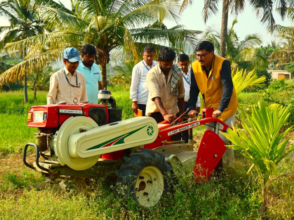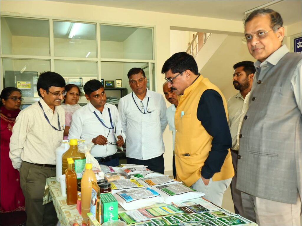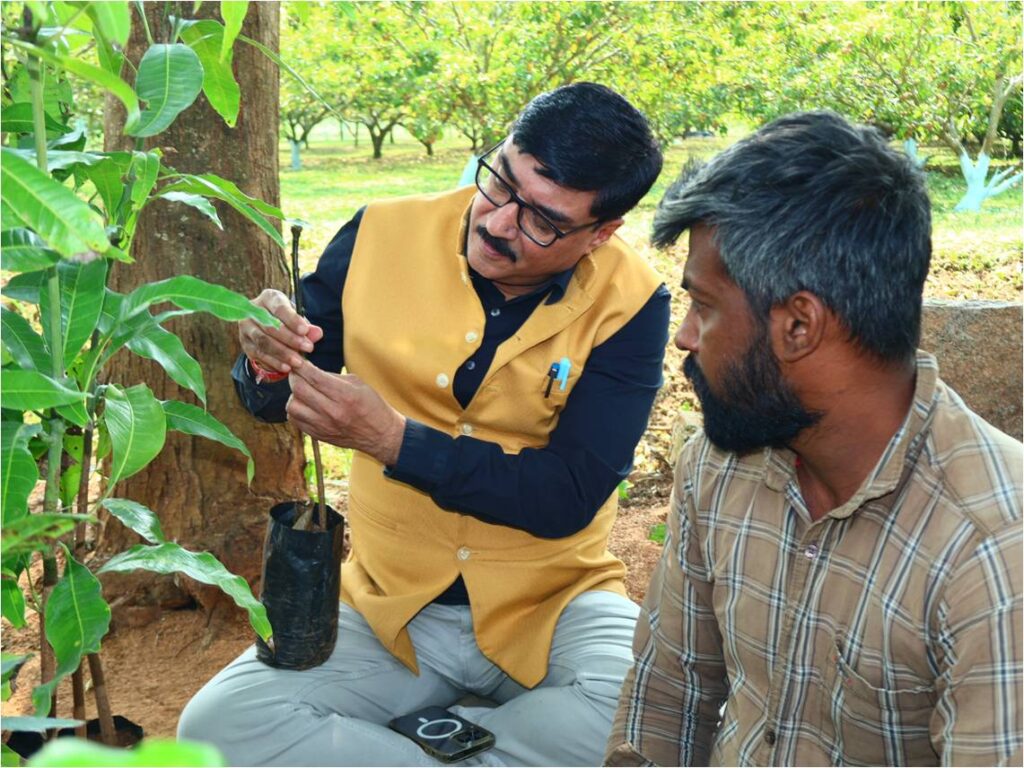 The dignitaries then proceeded to the KVK Instructional Farm, where they observed the nursery unit, fruit crop demonstration blocks, and the Jeevamrutha and Bio-digester production units. The DDG interacted with nursery grafting workers, skilled labourers, and field staff, appreciating their contributions to the farm’s productivity and outreach.