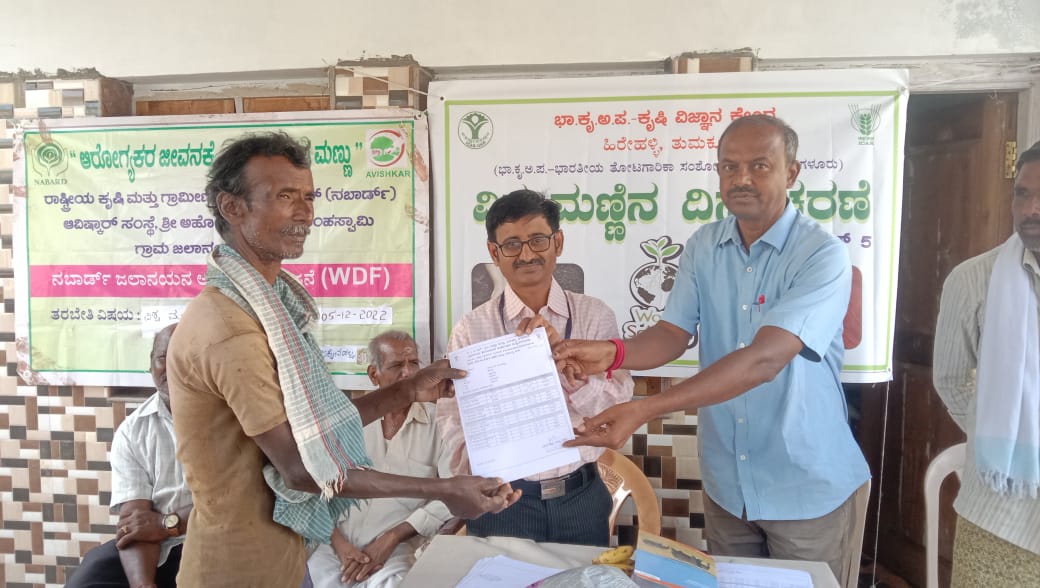 ICAR-KVK, Hirehalli,Tumakuru-II organized “World Soil Day” at Jaggenahalli, Madhugiri, Tumakuru on 5th December 2022 in collaboration with AVISHAKR, NGO, Tumakuru. Dr. Loganandhan, Principal Scientist & Head KVK, Hirehalli explained about the theme of this year Soil Day “Soils Where Food Begins”. He also explained about the various support that KVK provides with reference to Soil & Water Conservation. Mr. Anand, Head, AVISHAKR NGO, Tumakuru explained about importance of Soil fertility with use of organic manure, especially AMC from ICAR- IIHR, Bengaluru. In this programme Soil Health Cards were also distributed to the farmers and farm women. About 50 farmers were participated in the programme.