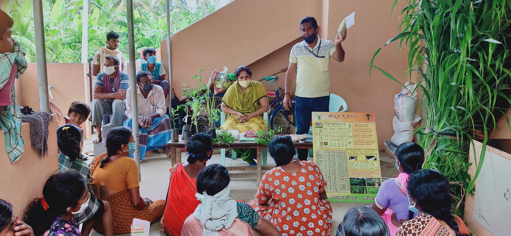 Off-campus training on Nutri-Garden was conducted on 17th July 2020 at Tanganahalli village, Koratagere Taluk. Mrs Radha R.Banakar, SMS-Home Science, KVK, Hrehalli explained the role of fruits and vegetables in daily diet to achieve nutrition security among farm family members. Mr Prashanth J.M, SMS-Horticulture, KVK, Hirehalli explained about the layout and use of organic micro nutrients and foliar application in nutri gardens. This training programme was attended by 20 farm womens from Tanganahalli village. Later basic data of selected farm families was collected and critical inputs where distributed to the selected farm womens and finally visited the spots where nutri gardens to be established.