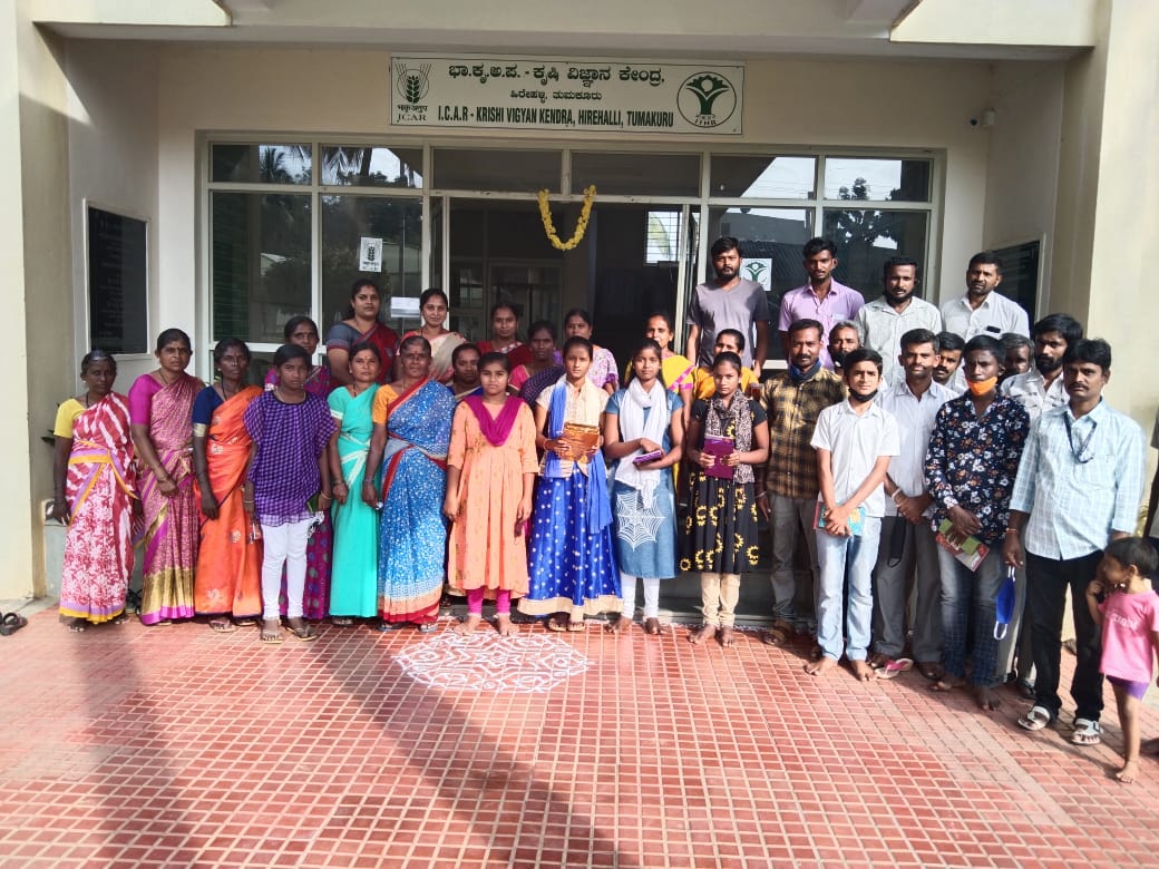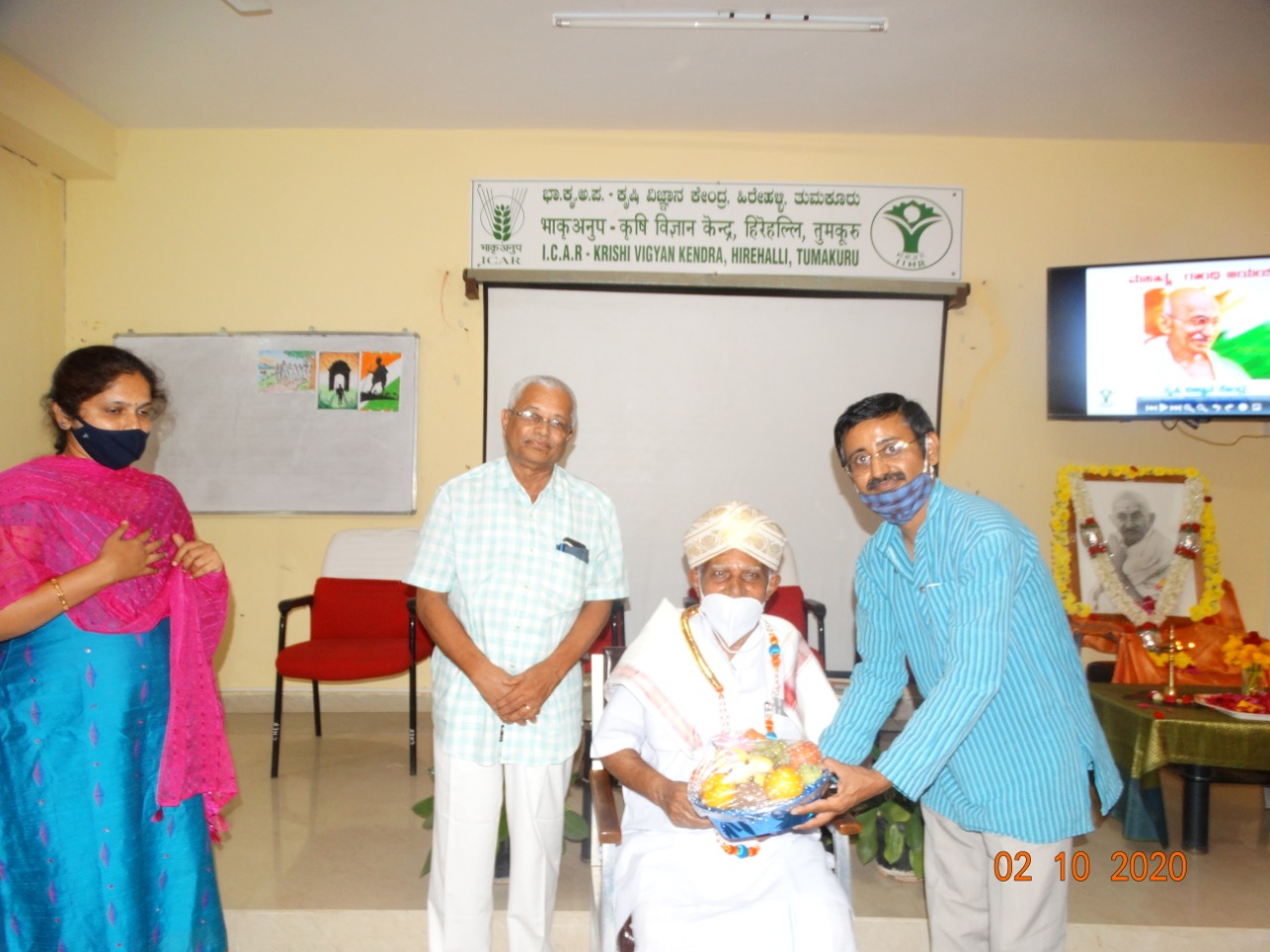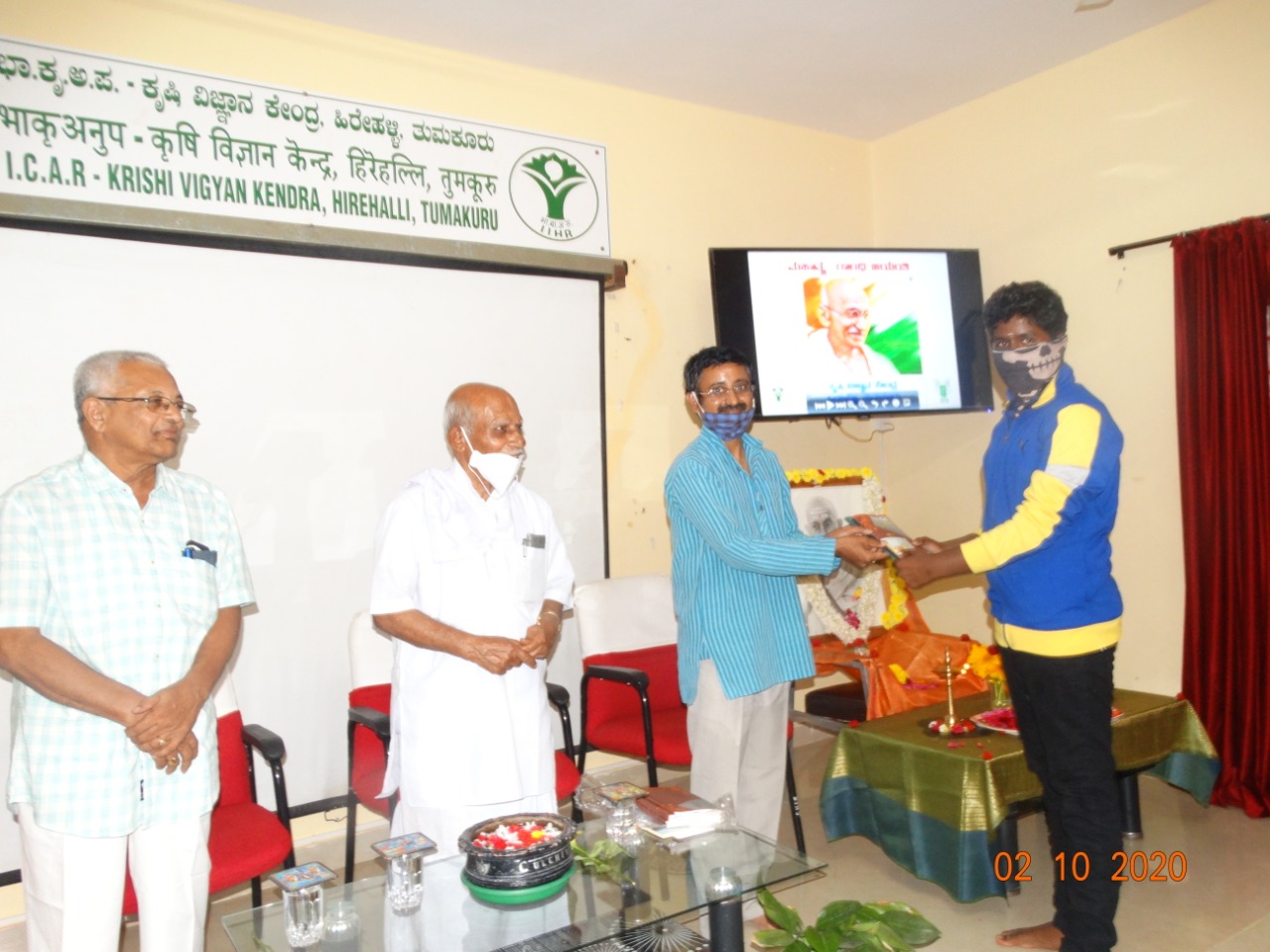 On October 2nd 2020, Gandhi Jayanthi programme was organized at ICAR-KVK, Hirehalli campus. Shri.Narasimmaiah, President of Karnataka Sarvodaya Institute took part as Chief Guest of the programme. Shri.Chandranna, Ex-Professor-Kannada, Tumakuru University and present Chairman, Red Cross Society, Speech and Hearing impact children Institute also took part in the programme as Guest of Honor. About 60 participants comprising staff and labor of KVK participated in the event. Dr.Loganandhan, Head, KVK welcomed the gathering. Shri.Narasimaiah, Gandhiian elaborated the sacrifice done by Gandhiji in getting freedom to our Country. Shri.Chandranna, explained about Shri. Lal Bahadur Shastriji, whose birth anniversary also fills on the same day, about his sacrifices to this country after the demise of Shri.Jawaharlal Nehru. Later, the chief guests distributed the prizes to the students who took part in the competition on October 1. The entire programme was compered by Mrs.Radha, SMS (HS).