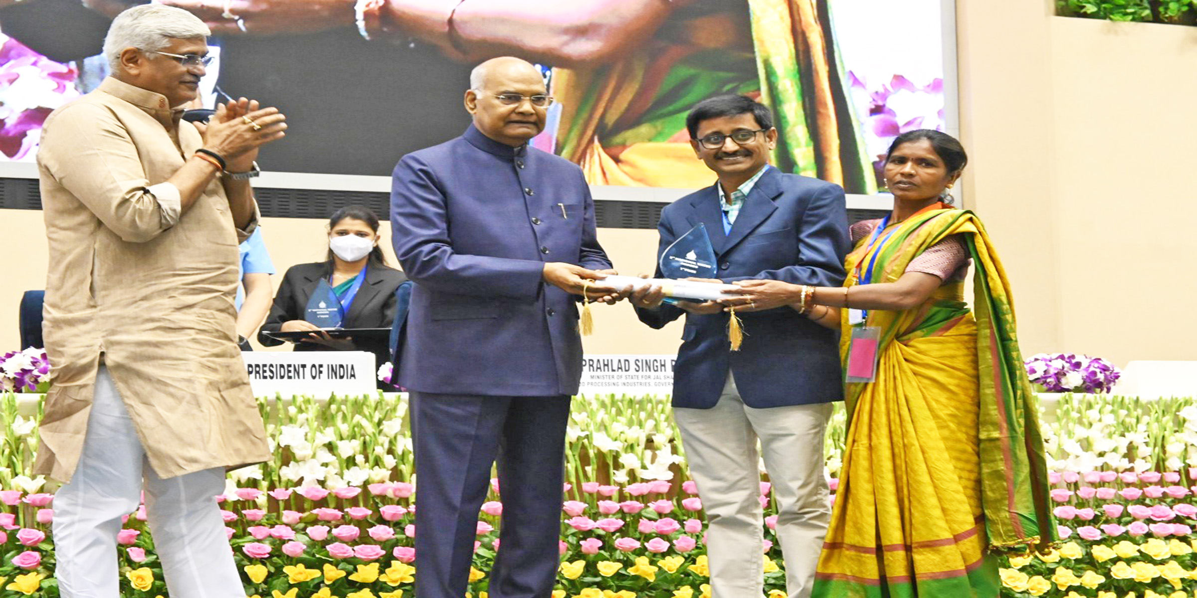 Dr. N. Loganandhan, Principal Scientist & Head, ICAR-KVK, Hirehalli received the Award from the Honourable President of India, Shri Ram Nath Kovind ji, in the third National Water Awards and Launch of Jal Shakti Abhiyan: Catch the Rain Campaign 2022 in New Delhi. Shri. P.R.Ramesh NICRA Nodal Officer, President and PDO of Yeleramapura Gram Panchayat also accompanied him during the award function.