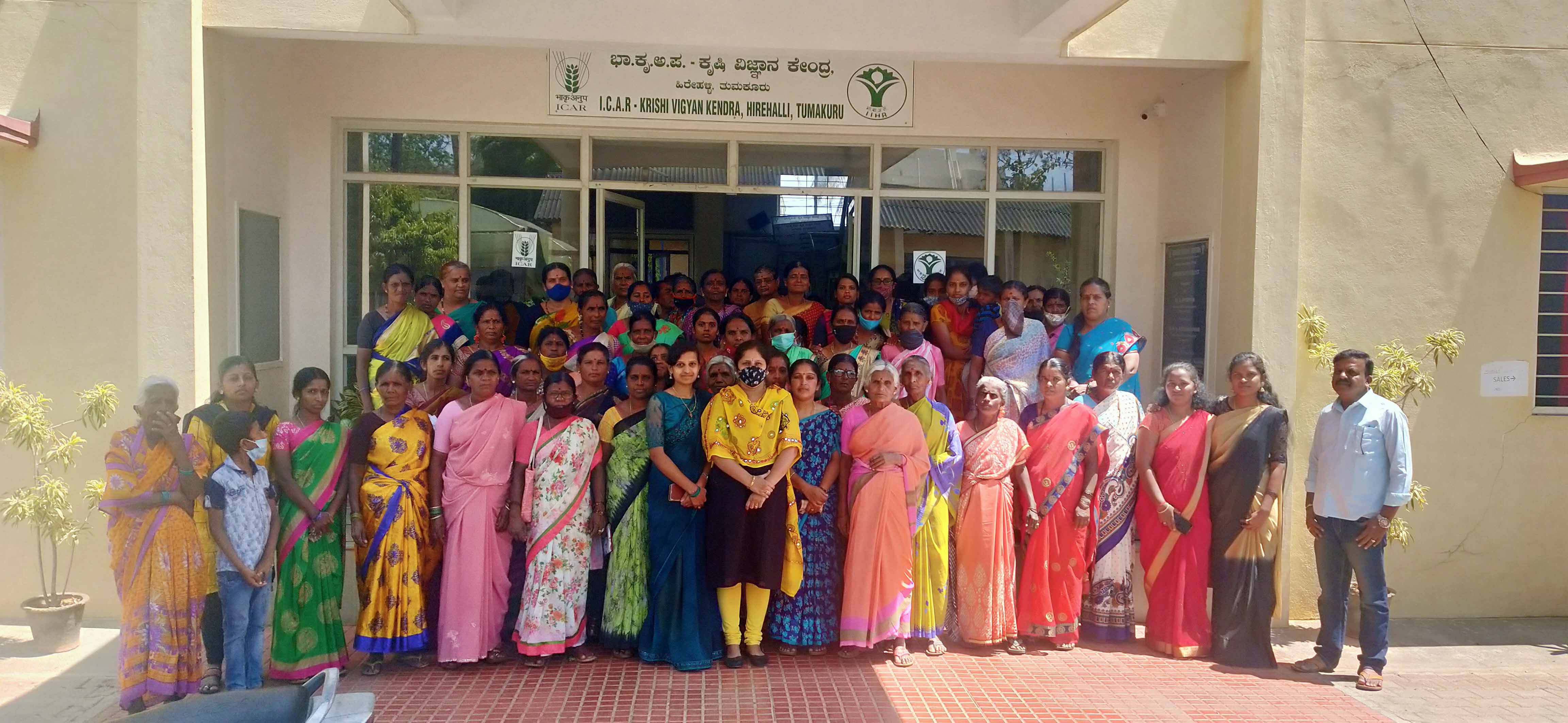 Special day programme on “International Women’s Day” was organized at ICAR-KVK, Hirehalli Tumakuru II on 8th March 2021 in collaboration with ATMA, Department of Agriculture, Tumakuru. This programme was attended by 55 farm women from in and around Tumakuru district. This event was inaugurated by Smt Sugandhini, Kannada Teacher, TVS School, Tumakuru. Dr, N.Loganandhan explained about the different programmes which are related to women empowerment at KVK, Hirehalli. Mrs Sugandini, spoken about how woman is playing an important role in overall development of the family and the society. She suggested women should make use of all the opportunities which are available through all the line departments in her inaugural address. Mrs.Radha R.Banakar SMS (Home Science) gave a lecture on nutritional importance of millets, fruits and vegetables for nutrition security. Programme was co-ordinated by Mr. Shridhar, BTM-ATMA, Department of Agriculture, Tumakuru.