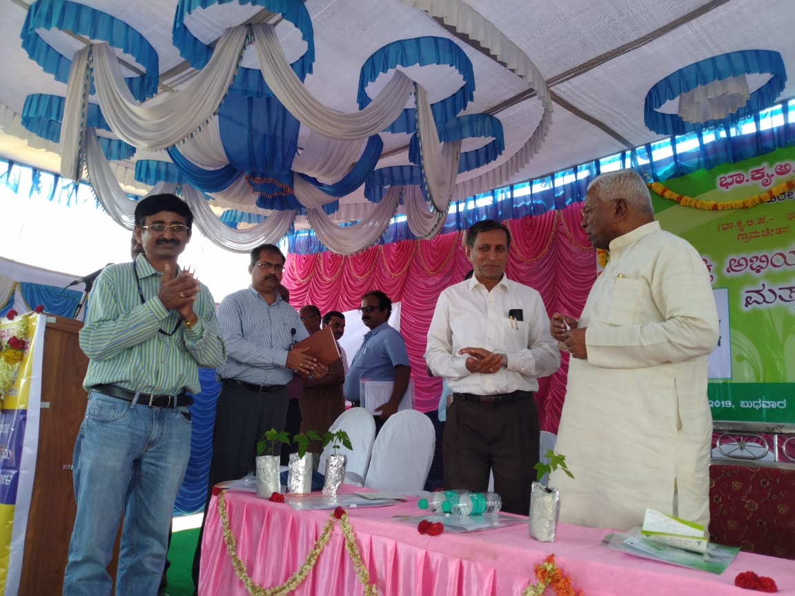 Jal Shakti Abhiyan Krishi Mela organized by ICAR-KVK, Hirehalli on 28th August 2019 at D.Nagenahalli Koratagere Taluk of Tumakuru District. The event was inaugurated by Shri.Basavaraj, Honorable MP, Tumakuru in presence of Dr.M.R. Dinesh Director IIHR Bengaluru. The purpose of programme was briefed by the Dr.Loganandhan N., Head ICAR KVK Hirehalli. He described about various blocks selected for organizing this abhiyana by the concerned KVK’s and the importance given by ICAR to bring awareness about water conservation among farming community. Honorable MP, in his inaugural address, stressed on the need of conserving water and appreciated the effort of the KVK in organizing this mela. The technical experts, Sri Mallikarjun Hosapalya, Anand Kumar and Engg Ramamurthy explained various methodologies to conserve the rain water and use them in judicial manner. Sri Mallikarjun Hosapalya, NGO Water expert, stressed on the need of people’s participation to make this abhiyana a successful one. Invited guests explained about the various schemes that could be useful for the famers to take part in water conservation activities in their fields. Programme ended with vote of thanks and millet lunch. About 800+ participants including farmers, farm women, staff of Panchayatraj institutions, various NGO and Dept. of Agriculture Sri Ashoka DDA & Sri Nagaraj ADA Koratagere line departments attended the programme. About 10 stalls also established to exhibit various technologies of soil and water conservation, in which many farmers visited and benefitted. During the day Dr.M R Dinesh Director and Shri Basavaraju GS Hon. MP witnessed the work and appreciated work done at NICRA Village.